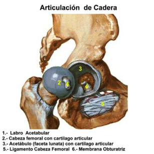 Ligamento cabeza femoral (redondo): intracapsular, 3.5 cm de longitud, su tamaño y fuerza es variable, además de transportar la arteria hasta la cabeza femoral no conoce su función (incluso puede estar ausente).Se inserta en bordes escotadura y ligamento transverso y la fosa femoral. Se sitúa dentro de la cápsula fibrosa y está rodeado por membrana sinovial (fuera de la cavidad sinovial).La membrana sinovial reviste la cara interna de la cápsula fibrosa y sobresale de ella por el cuello femoral. Tapiza la fosa acetabular, recubre el cuerpo adiposo de la escotadura del acetábulo (éste se sitúa en la fosa acetabular) y el ligamento transverso. La articulación es multiaxial y realiza movimientos de flexión, extensión, abducción, aducción, rotación lateral, rotación medial y circunducción