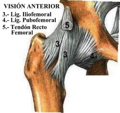 iliofemoral: banda fuerte, anterior y con forma de Y. Se inserta proximalmente a la espina iliaca anteroinferior y borde acetabular. Poseen fascículos; superior, corto fuerte y resistente, sigue el borde superior de la cápsula y termina en el borde anterior del trocánter mayor, debajo del tendón del glúteo menor; inferior , más delgado desciende casi vertical sobre la parte anteromedial de la cápsula y se fija algo por delante del trocánter menor.Ligamento pubofemoral: se inserta la porción púbica del borde acetabular y eminencia iliopúbica, cuerpo y rama del pubis y se une con la parte medial del ligamento iliofemoral (fascículo inferior). Refuerza inferior y anterior la cápsula. Es débil, pero contribuye a evitar la separación excesiva del muslo Ligamento isquiofemoral: refuerza posteriormente. Se inserta en porción isquiática del borde acetabular y sigue un trayecto superolateral espiral dirigiéndose al cuello del fémur, medial a la base del trocánter mayor. Impide la hiperextensión.