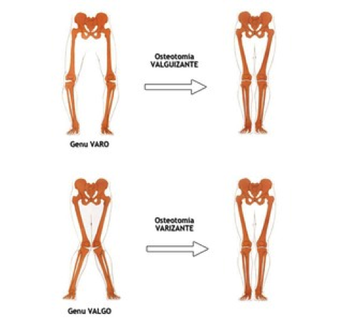 Las más frecuentes son las osteotomías valguizantes de rodilla. Las mismas se realizan a nivel de la tibia. La corrección de la deformidad se puede obtener mediante la adición de una cuña en la zona medial o interna (osteotomía de adición) o mediante la sustracción de una cuña en la zona lateral o externa (osteotomía de sustracción). La indicación de la misma depende de varios factores a tener en cuenta y que su traumatólogo le explicará en consulta. Por lo general, el paciente debe permanecer ingresado entre 2 y 4 días luego de la cirugía para un control apropiado del dolor y el inicio de la rehabilitación.